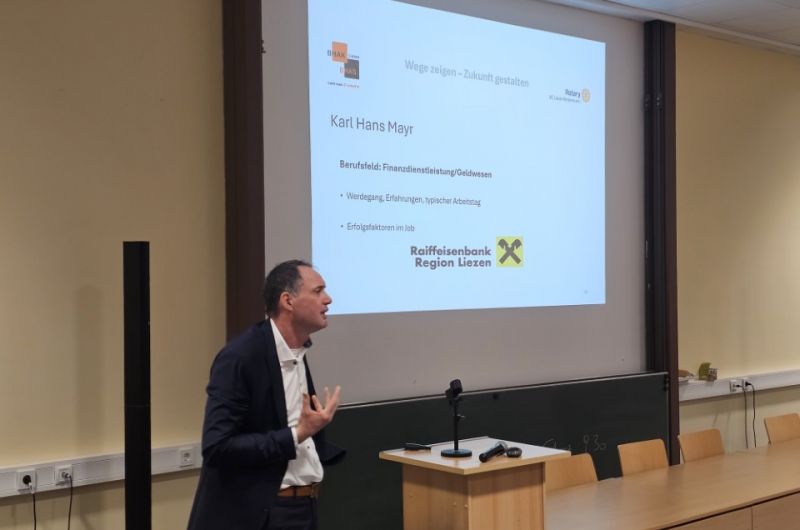 An der BHAK/BHAS Liezen fand ein abwechslungsreicher Berufsinformationstag statt, organisiert vom Rotary Club Liezen‑Rottenmann. Vertreterinnen und Vertreter aus unterschiedlichen Fachbereichen gaben den Schüler:innen spannende Einblicke in ihre beruflichen Werdegänge und Tätigkeitsfelder. Zu Gast waren Herbert Decker (MFL Liezen), Dr. Elke Wulz‑Hofstätter (Unfallchirurgie Vöcklabruck), Dr. Erich Pötsch (HBLFA Raumberg‑Gumpenstein), Dr. Walter Kreissl (Rechtsanwalt) sowie Dir. Mag. Karl‑Hans Mayr (Raiffeisenbank Region Liezen).